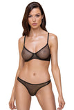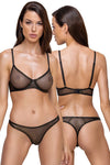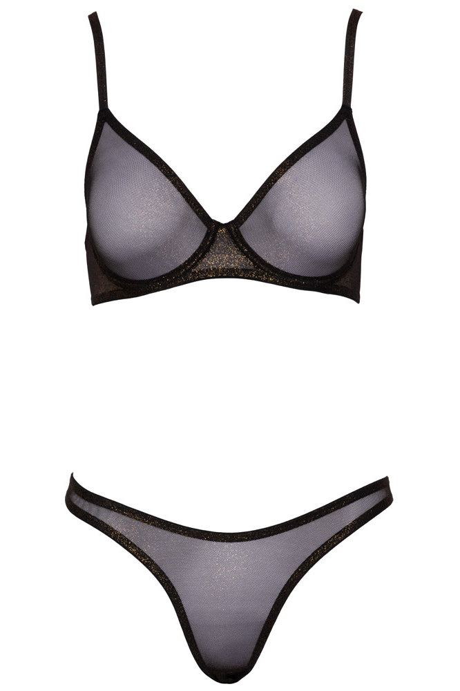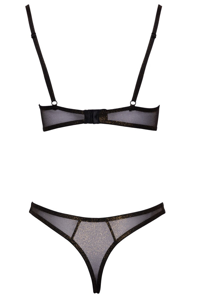 The perfect outfit for underneath clothing! The underwired bra and string in a set from Cottelli LINGERIE is made out of delicate, black net with a sparkly gold shimmer. It is made out of stretchy material for a perfect and comfortable fit. The seamless, preformed bra with underwired cups can't be seen underneath skin-tight outfits. The straps can be adjusted for a perfect fit and there is also a hook fastener at the back for even more comfort.