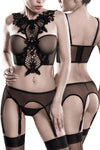 Crafted from sumptuous, transparent mesh and adorned with intricate crochet lace, this lingerie set exudes a captivating blend of sophistication and sensuality. The top offers a playful and alluring silhouette, while the thong and suspender belt complete the look with a touch of irresistible charm.