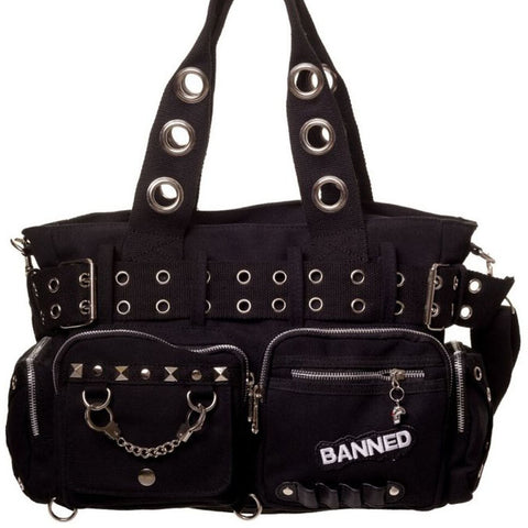This large handbag / shoulder bag has lots of different compartments. Inside the main compartment there is a zipped purse pocket, two open pouch pockets and some pen holders. This section closes with a zip. On the back of the bag there is a pouch pocket which closes with a press stud and on the front there are two zip pockets - one of which has an additional zip pocket on the front with 'Banned' Logo patch and a metal skull zipper pull. The other has a small zip pocket under a press stud flap which is decorated with studs and a pair of mini handcuffs which hangs from two d-rings. There are also another two zip pockets - one on each end of the bag. There is a canvas eyelet belt which runs around the top of the bag and the carrying handles also feature large eyelet decoration. In addition there is a clip on adjustable shoulder strap. A great Goth bag for all your dark essentials!