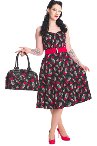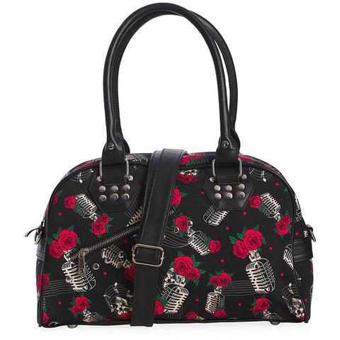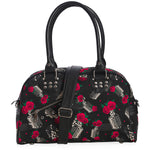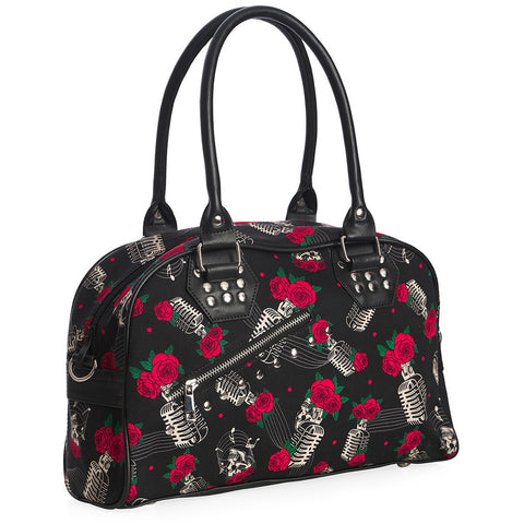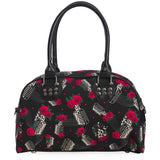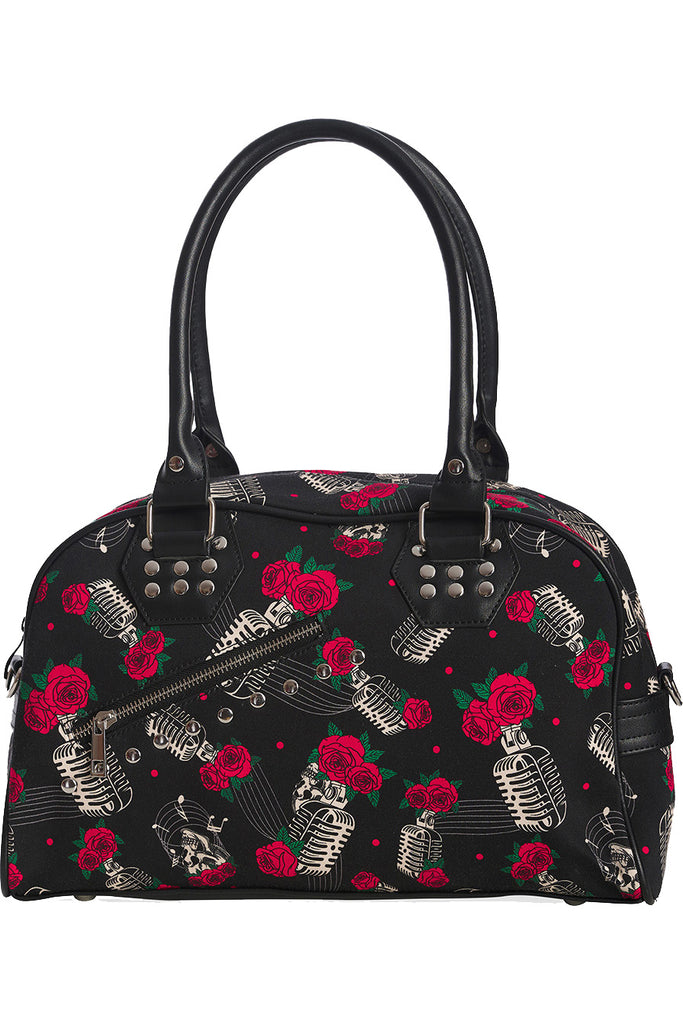 Printed studded canvas bowling bag with detachable shoulder straps.