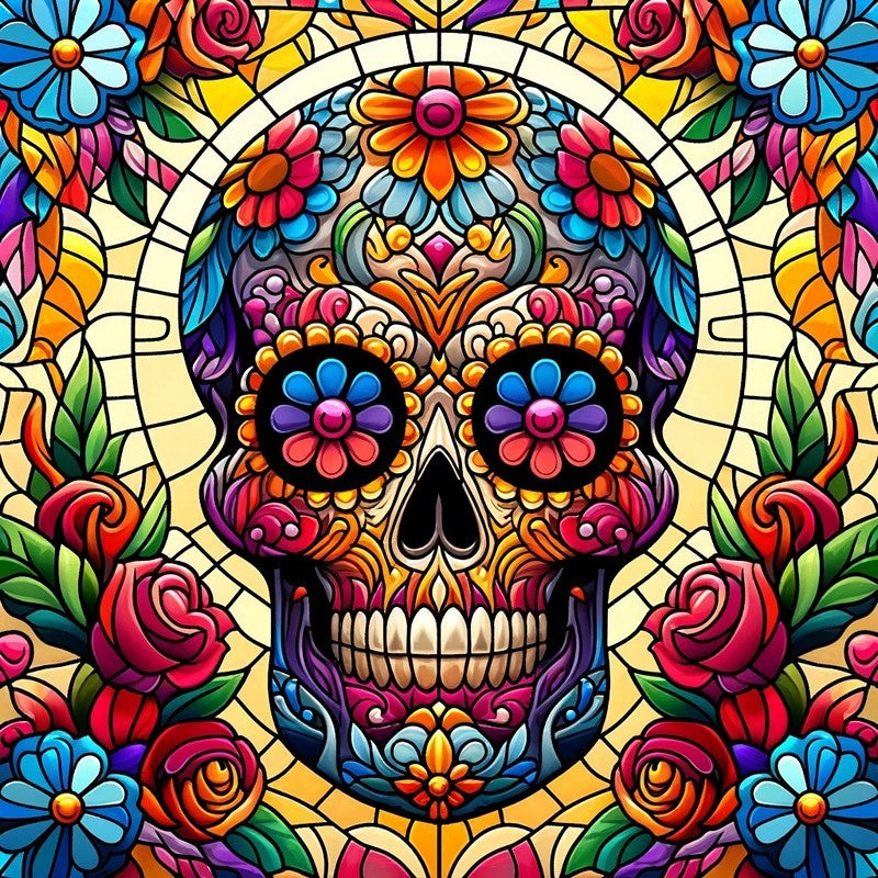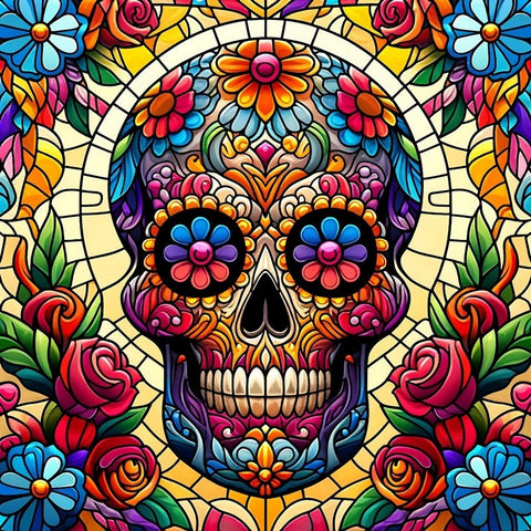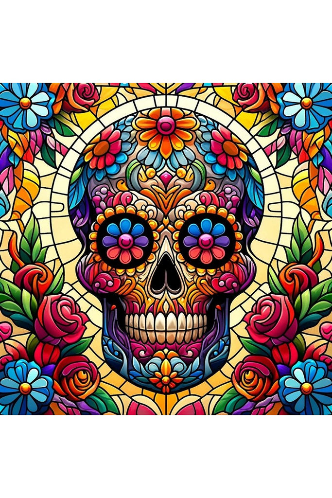 Celebrate life and remembrance with our Day of the Dead Bloom Print. This stunning artwork transforms the traditional sugar skull into a vibrant, stained-glass masterpiece. Adorned with intricate floral patterns and swirls, the skull is a celebration of the Día de los Muertos tradition.