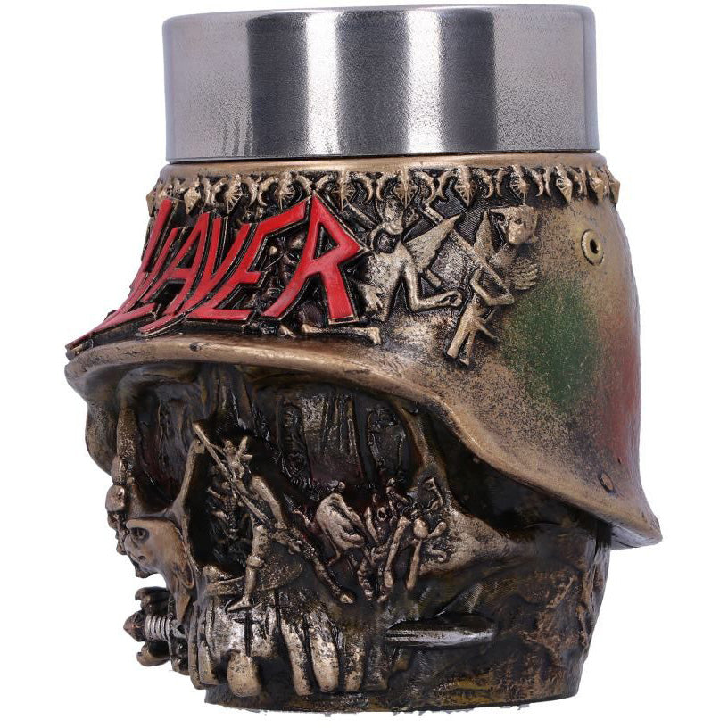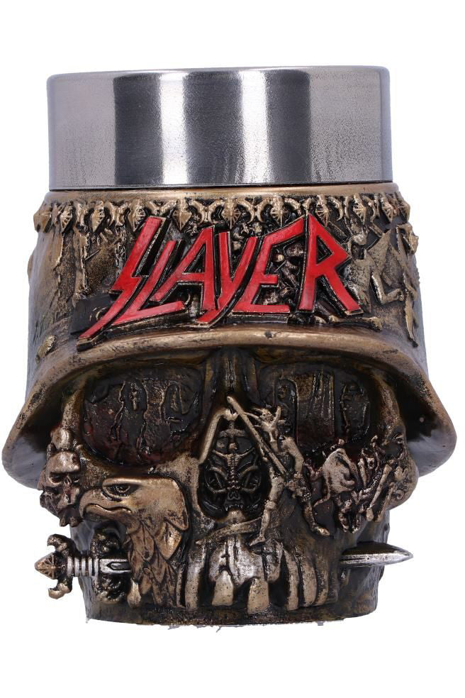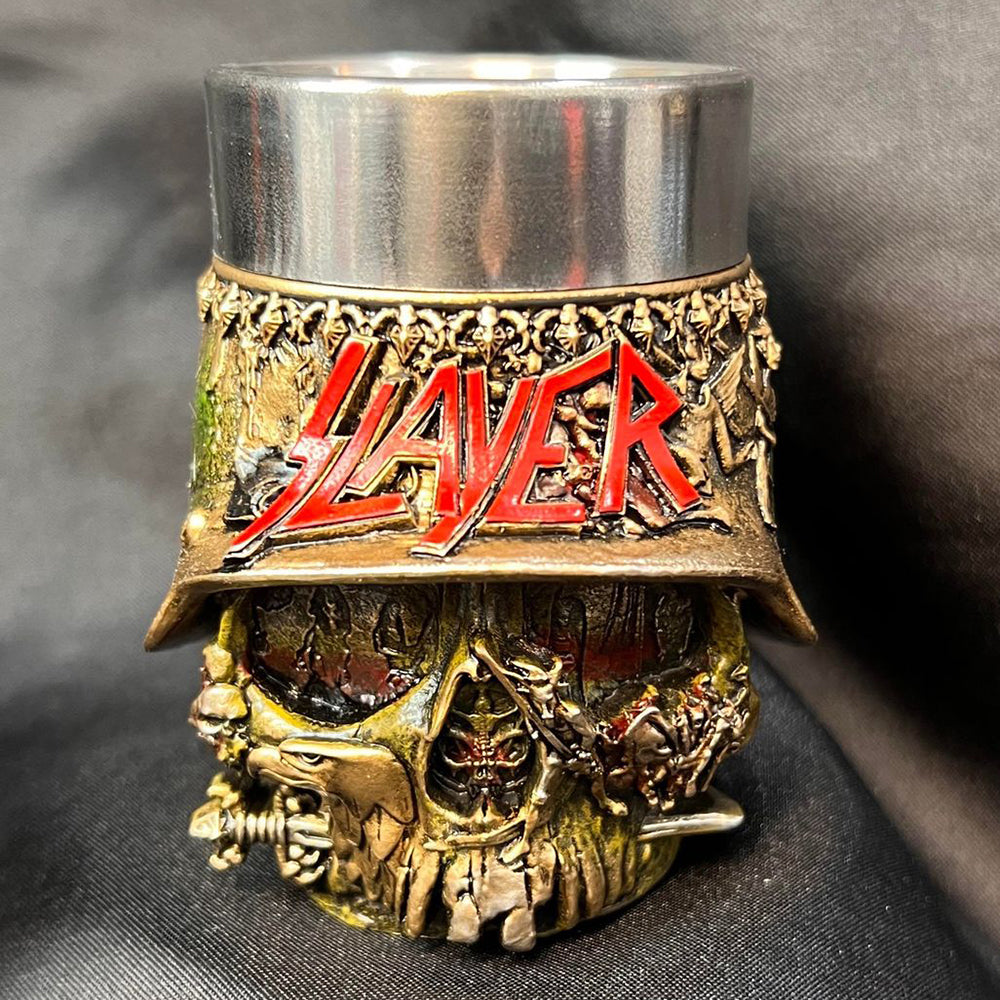 Pay homage to the thrash metal gods with this officially licensed Slayer Shot Glass. Designed to incorporate their Helmet Skull band artwork, this piece instantly brings to mind Slayer’s fast tremolo picking, double bass drumming and shouted vocals. Cast in high-quality resin and hand-painted, this Shot Glass features a removable stainless steel insert so you can spend less time cleaning and more time moshing!