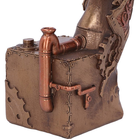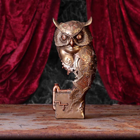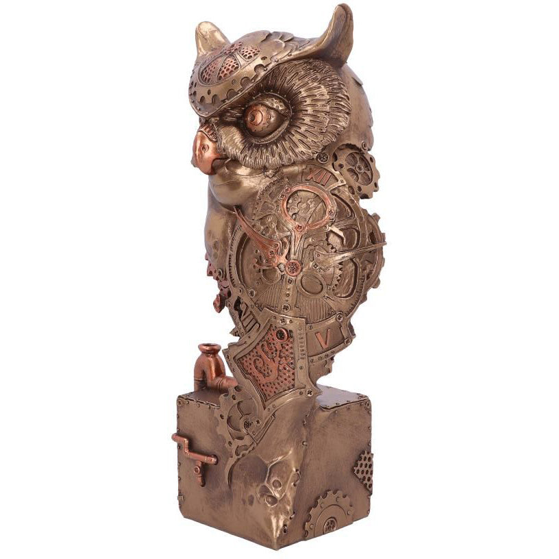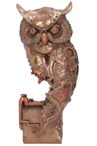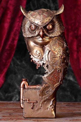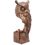 This wise, old, mechanical owl, sits perched on top of a cube, wings covered in cogs and ticking hands of a clock in the centre. Sitting peacefully and wide eyed ready to take flight, this owl is cast in the finest resin before being expertly hand-painted and finished in bronze. This Owl will make the perfect addition to any Steampunk collection.