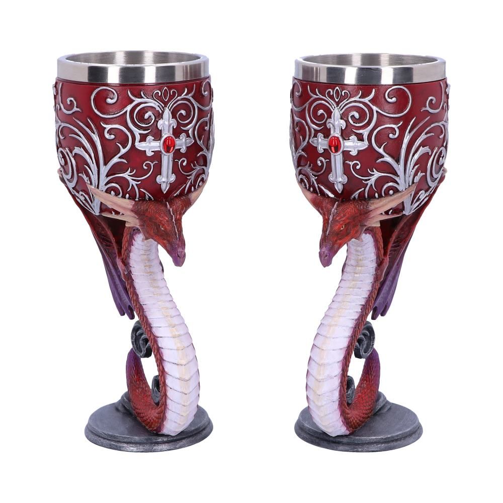 “When I look into your eyes, I see the promise of love” Adorned with intricate silver baroque detailing rising from the metallic base to the stainless-steel rim, this Goblet is the perfect addition to any fantasy collection. The carefully sculpted stem is formed by the body of a fearsome Red Dragon. Above it is an ornate cross, at its heart is a red gemstone. Cast in high-quality resin and carefully hand-painted these Dragons Devotion goblets can be paired together to form the shape of a heart, perfect for sharing with your mystic love.