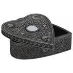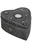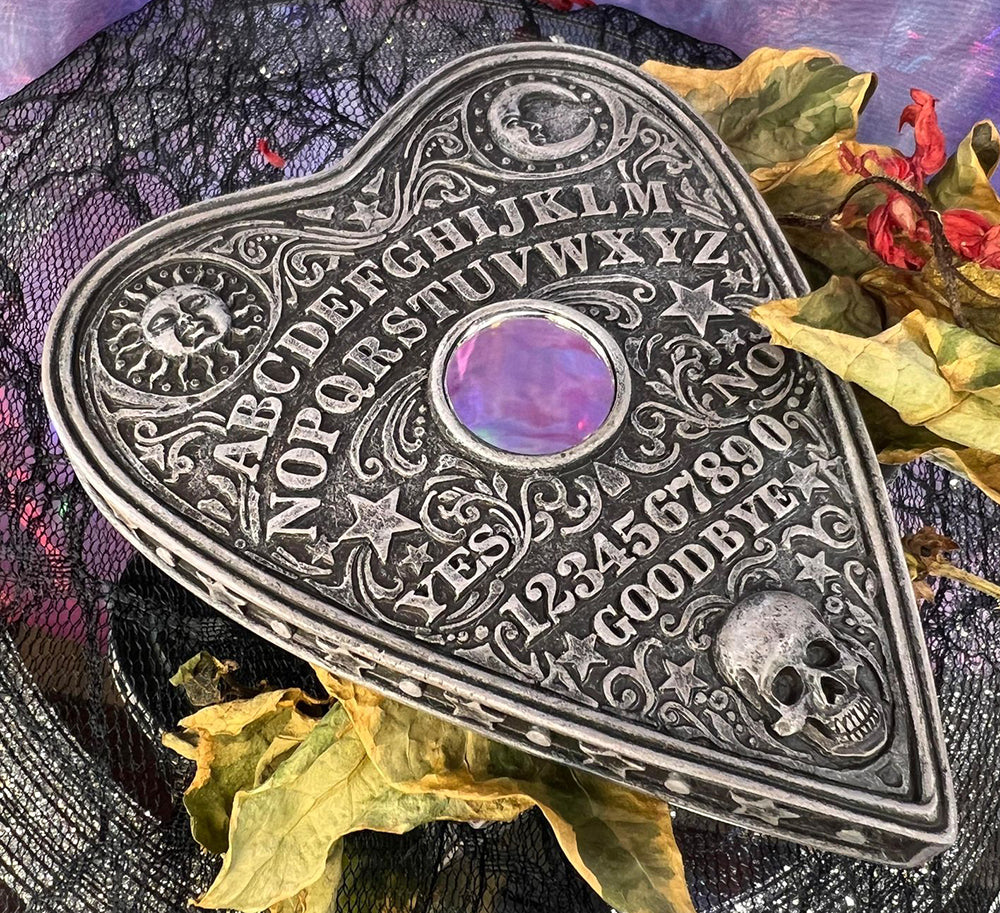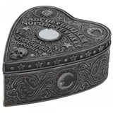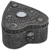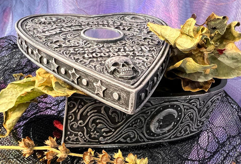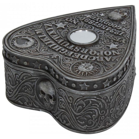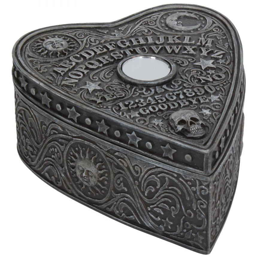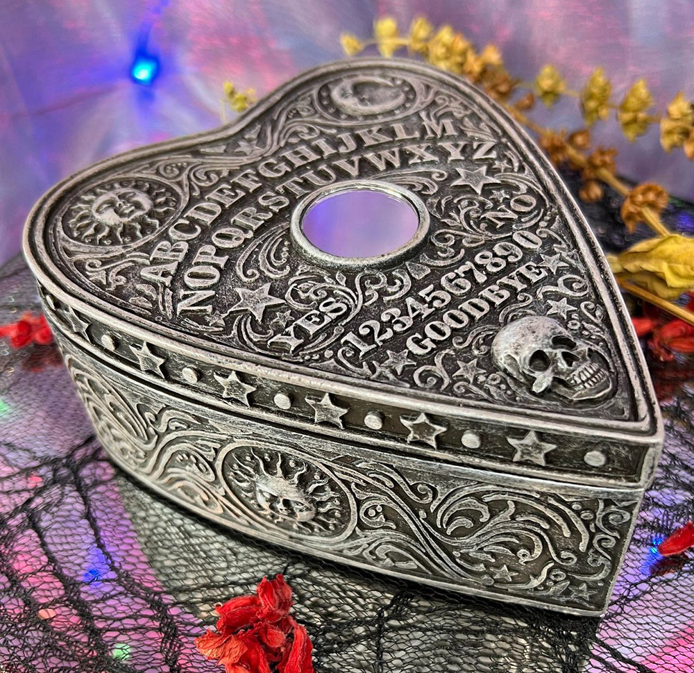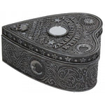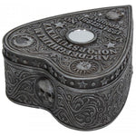 Keep messages from beyond the veil in this heart-shaped Spirit Board box. The sides of this box show the sun and moon from the spirit board, surrounded by ornate detail. On top, a spirit board is picked out in meticulous detail, a small round mirror in the centre. Shaped like a planchette, this box is cast in high-quality resin, hand-painted, and is the perfect way to store gifts from the spirits.