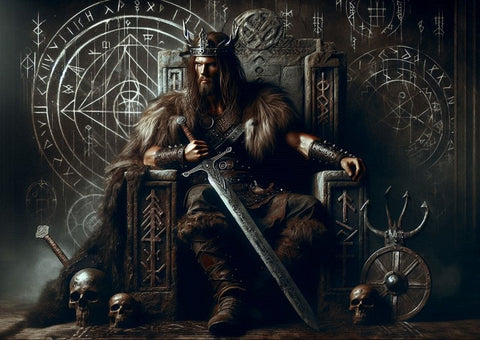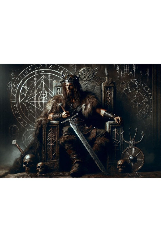 He holds a large sword across his lap, resting one arm on the throne's armrest, a symbol of his raw power and readiness for battle. The dark, atmospheric hall is a testament to his legacy; behind him, large runic symbols and inscriptions are etched into the stone, while human skulls, an axe, and a shield lie on the ground, signs of his many conquests. This print captures a mood of solemn might and profound tradition.