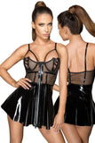 This dress is a captivating fusion of alluring design and eye-catching details. The semitransparent bustier features striking stripes and beautiful embroidery on the cups, adding a touch of intricate flair. Shaping bones ensure a flattering silhouette, while adjustable vinyl straps and decorative straps provide a customizable fit and a hint of edgy allure.