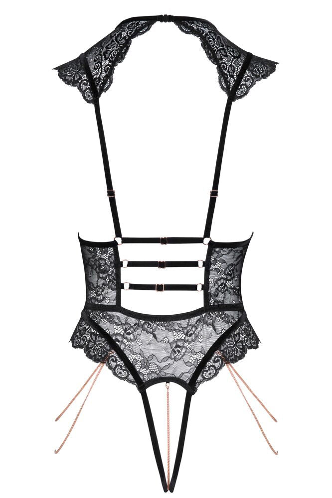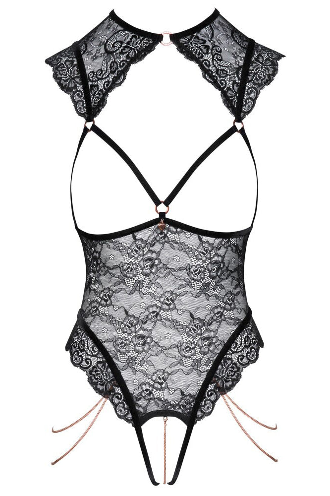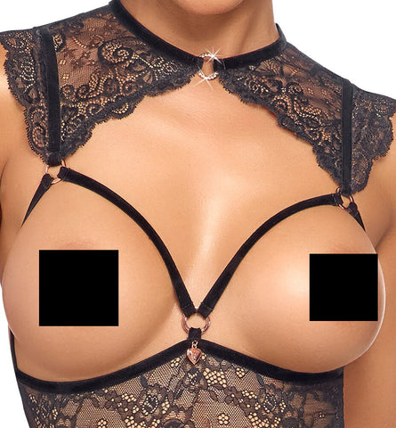 Our design team has thoughtfully combined delicate black lace with plush velvet straps and sophisticated rose gold-coloured accessories. The result is a piece that feels luxurious and unique. The body features seductive open cups and graceful lace that extends to cover the shoulders. For a touch of sparkle, a brilliant rhinestone ring sits at the front of the neck, leading to a small, secure hook fastener at the back. A beautiful heart-shaped pendant rests between the open cups, adding a final, romantic detail.
