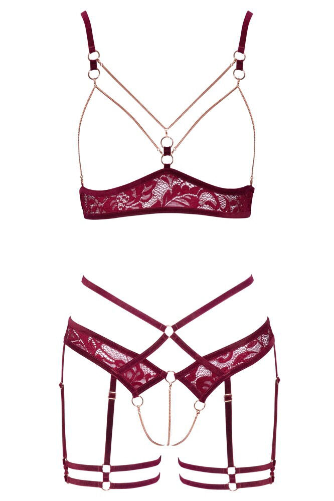 Our expertise is in the details. The set features a stunning open-cup bra and crotchless suspender briefs, both adorned with luxurious velvet straps and elegant rose gold-coloured accessories. We’ve designed the decorative chains to perfectly frame the open cups, adding a sensual and sophisticated touch.
