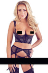 We've focused on the details that make you feel incredible. The bustier features slightly padded, underwired cups for a beautiful lift and is adorned with sparkling rhinestones and elegant velvet straps. Lace inserts at the front and on the straps add a sophisticated, finished touch. The matching crotchless string and suspender belt are also made almost entirely of lace, with decorative velvet straps and clips hidden by a beautiful satin ribbon.