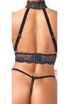 Our design expertise shines through in the thoughtful details. The open-cup top features adjustable velvet and bra straps, allowing you to customize the fit to your body. The lace halterneck fastens securely with two buttons at the back, while a hook fastener at the back of the bra ensures a perfect fit. The luxurious velvet straps and shimmering rose gold-coloured chains add a seductive touch, providing a beautiful contrast against the black lace.