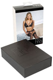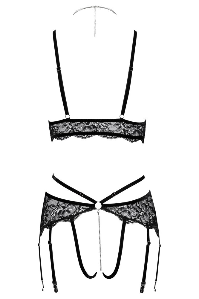 This isn't just lingerie; it's a statement of confidence. Our Abierta Fina Seductive Set, which includes a bralette and a crotchless suspender thong, is crafted to make you feel beautiful and empowered. We've expertly combined fine, stretchy black lace with soft velvet accents and sleek silver-coloured rings and chains, creating a look that's both daring and elegant.