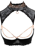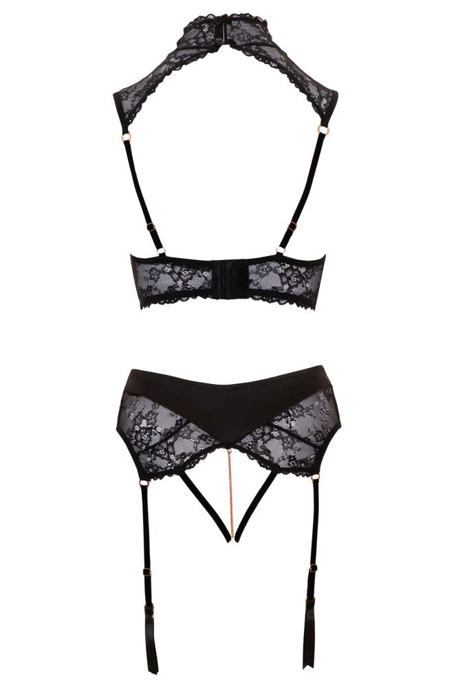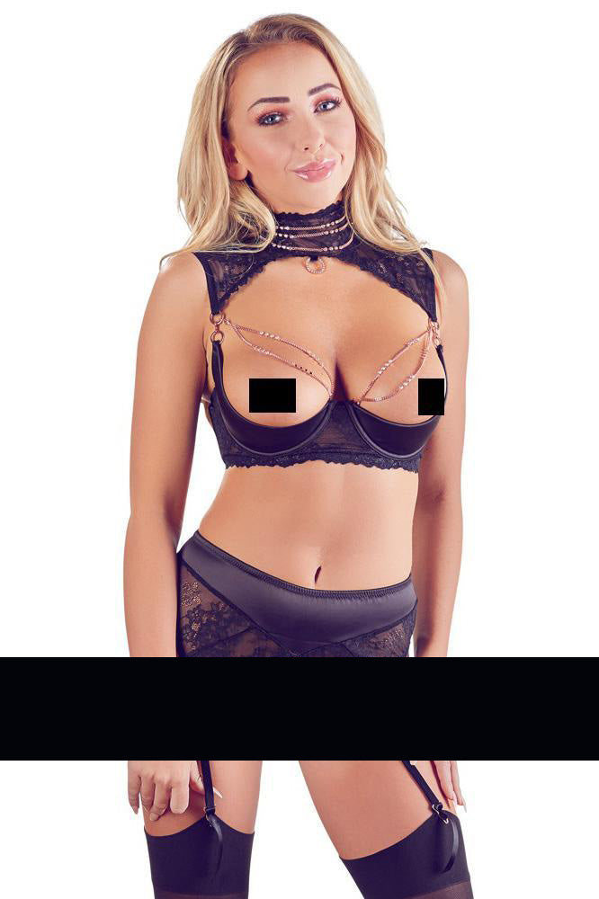 Our design expertise is in the details that make you feel incredible. The shelf bra features decorative lace inserts that extend over the straps and a wide collar, creating a stunning visual. The rose gold-colored decoration wonderfully emphasizes the cleavage area and sensually stimulates the crotch with every step. All decoration can be removed with small snap hooks, giving you the freedom to customize your look. The crotchless string is just as alluring, with satin ribbons over the clips on the four suspender straps.