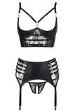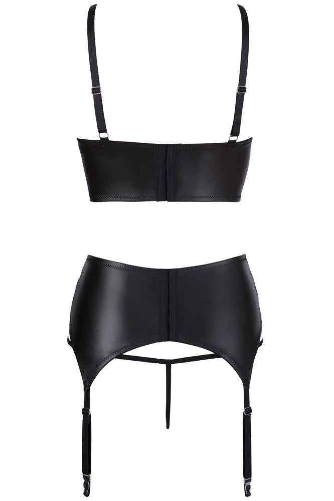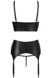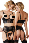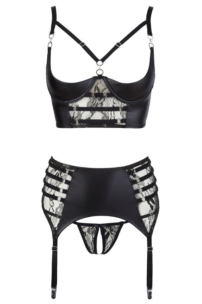 Our design expertise is in the details that make you feel incredible. The bustier features a slightly padded shelf bra that perfectly emphasizes your breasts. Delicate strap details and beautiful ornamental rings in the cleavage area add a sensual touch. The matching suspender belt and the inviting crotchless briefs complete this erotic ensemble.