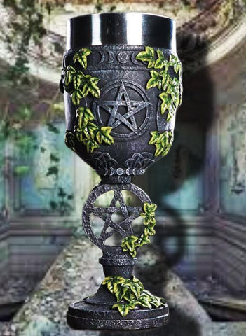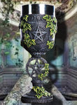 Entwined in climbing Ivy, this Aged Pentagram Goblet is perfect for adding a magical touch to any space. Cast in high-quality resin before being expertly hand-painted, this goblet has a pentagram symbol on both the stem and bowl of the goblet.