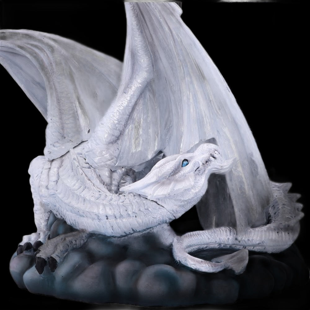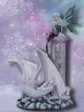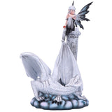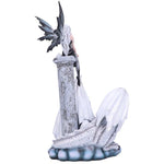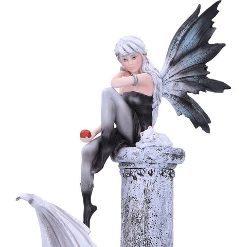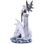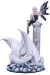 Sitting high atop a rock pillar is a small fairy, looking down on the icy dragon that sits below. This majestic creature with white glistening wings looks up to her whilst protecting her from any threats that come their way. She holds a ruby red apple, and waits for the perfect time to reward her loyal companion. Cast in the finest resin, before being expertly hand-painted, this figurine is perfect to add to any fantasy collection!