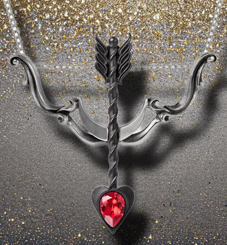 Son of the classical mythology gods Venus and Mars, Cupid is the god of passionate desire. Erotic love will overwhelm any victim of his astutely aimed arrow. Love may strike whist wearing this stunning statement piece! manifest love, wear love, get love! An elegant but striking cupids bow and arrow necklace. A hand polished baroque bow with crescent moon detail and contrasting black pewter arrow. A heart shaped arrowhead is inlaid with the most beautiful of Austrian crystals, a red Siam tear drop.