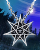 The Wiccan symbol of the seven pointed star, or septagram, represents the seven paths to the higher self in the sacred Faery tradition, further empowered here by a pentagram and the sigils of the seven planets. A beautiful Wiccan inspired piece perfect for day to night wear!