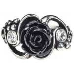 A romantic motif concealing a secret libertine passion for wine and sensual pleasures. An intoxicating combination of the black rose of dark desire and the grapes of hedonism. Polished pewter rose and grape vine ring, with black resin rose at its centre and a clear crystal Swarovski gem either side.