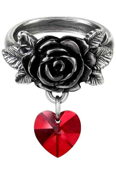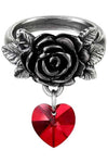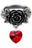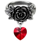 An antiqued pewter ring with a black rose at its centre, and from beneath which suspends a deep red Swarovski crystal heart.