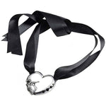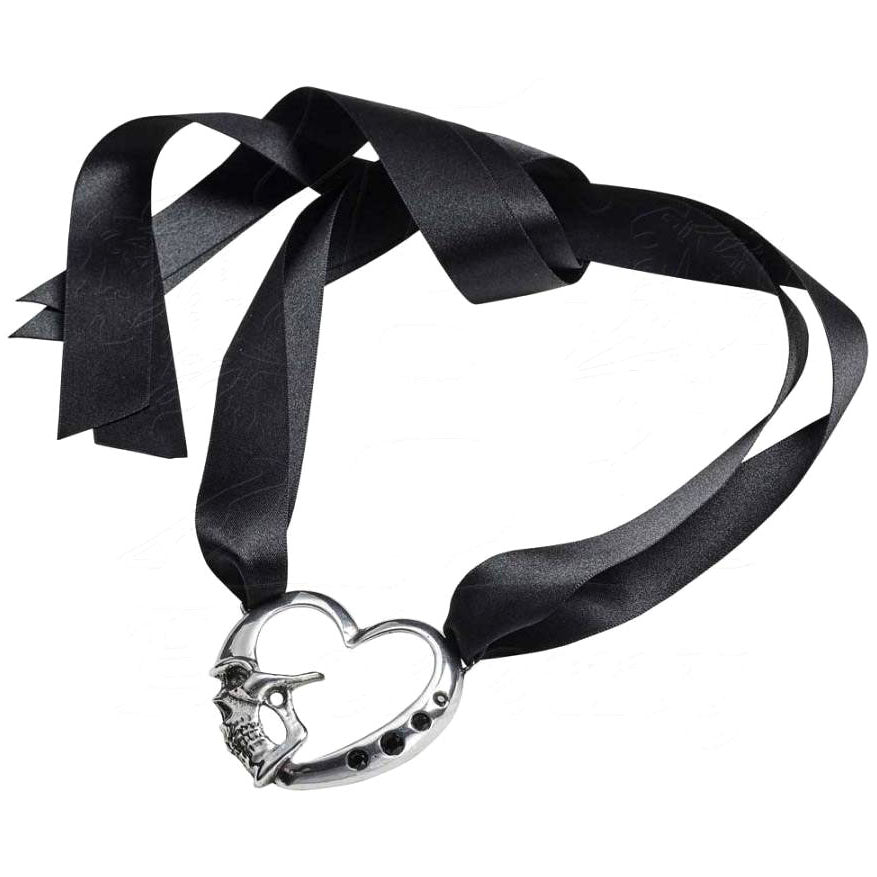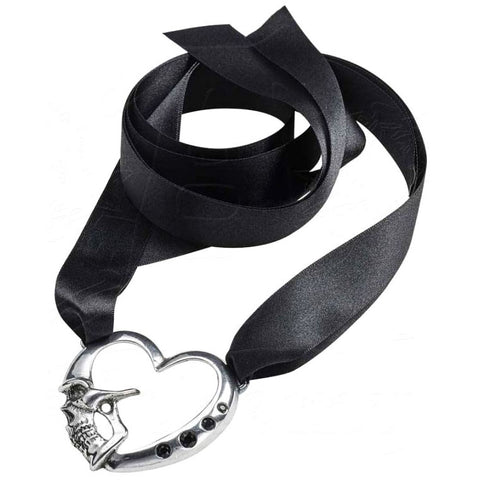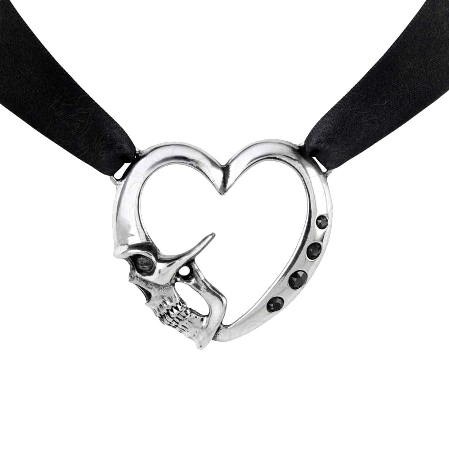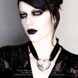 A very large, polished pewter heart frame choker-necklace with the detailed profile of a skull on its right side and set with four black swarovski crystals on the left.