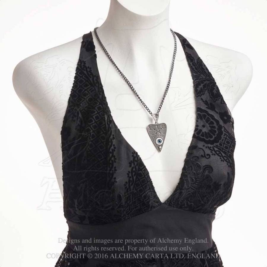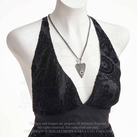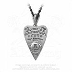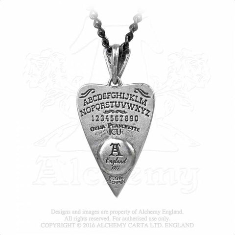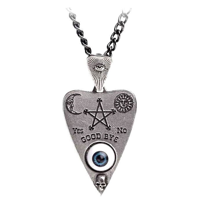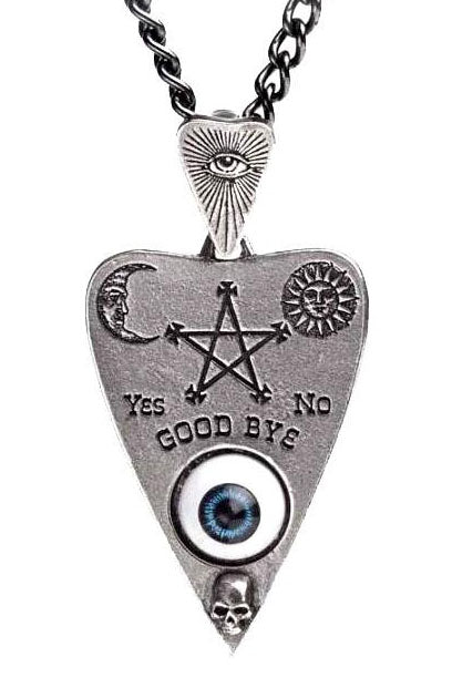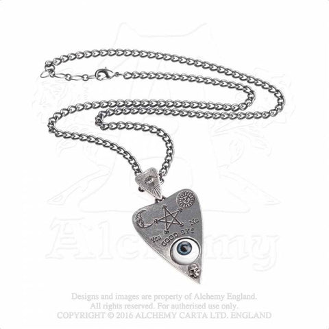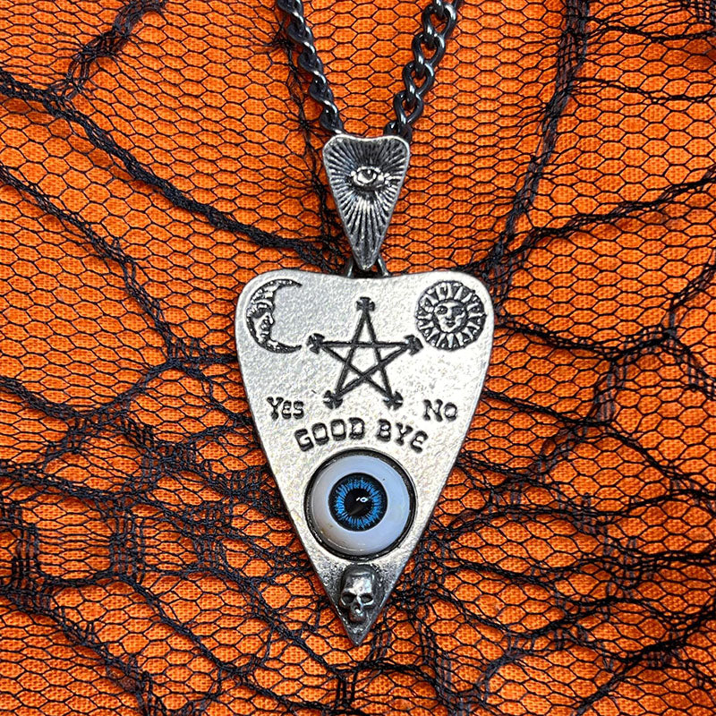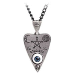 Technology from the 19th century seance; a spiritualist's device for communicating with the dead through the 'talking board', and discovering mysteries on the other side... ICU! A pewter pendant shaped as a seance planchette, or ouija pointer, engraved with mystical symbols, plus the alphabet on the reverse, and with a realistic acrylic eye set into the recess.