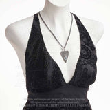 Suspended from a pewter bale on a black, 21"/48cm curb chain plus a 1 ½" extender chain.
