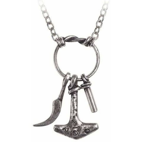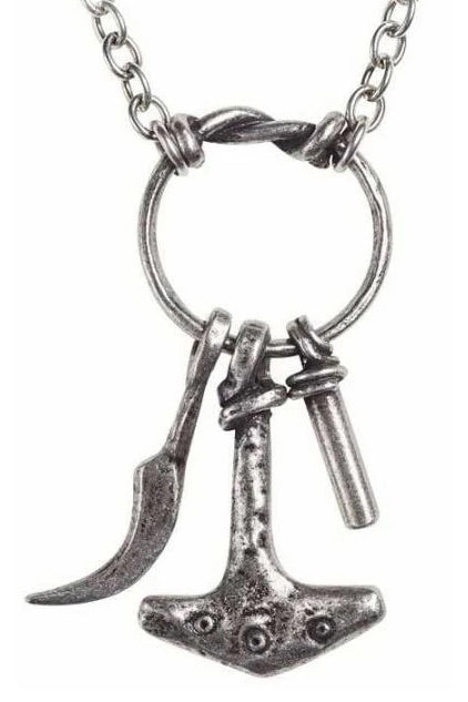 Mjolnir, Thor's hammer, a sickle and a firesteel, (protection, food and fire), everything a Viking would need to survive. A talisman of survival!