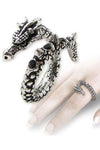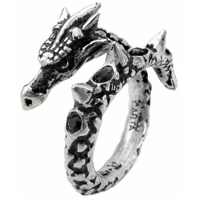 The living power; overwhelming energy and the force of life encircles and liberates the wearer. An orm or wyrm, in European tradition, a wingless, legless dragon. An intricately-designed ring of fantastical proportions. A pewter wrap-around dragon-serpent ring, set with three black Swarovski crystals. Can be gently opened and squeezed closed to fit.