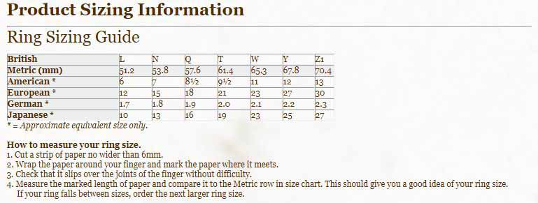 Ring is available in sizes Small (L-N), Medium (Q-T), Large (W-Y).