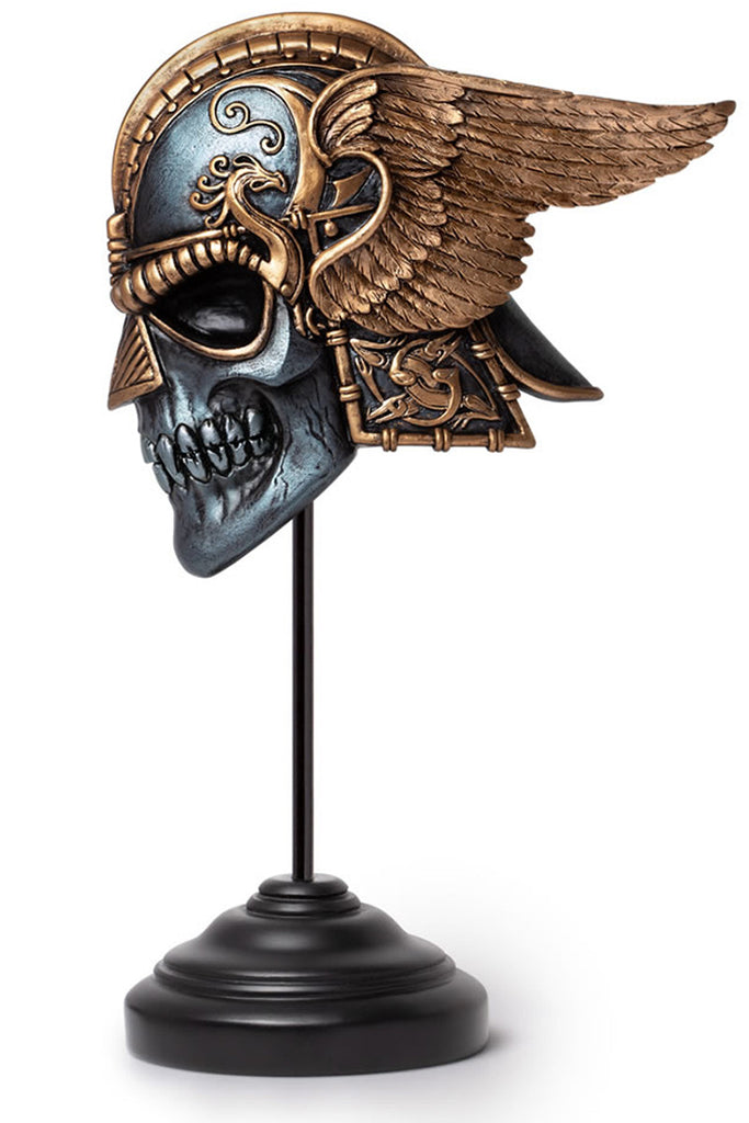 The magnificent raven-winged helmet of the Viking deity for the warrior cult. Unleash your inner warrior with our striking Viking Skull Ornament, a captivating piece that pays homage to the legendary Norse culture. This unique ornament features a detailed skull adorned with a raven winged Viking helmet, enhanced with exquisite gold detailing that adds a touch of elegance to its fierce design.