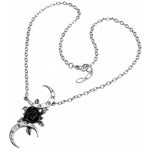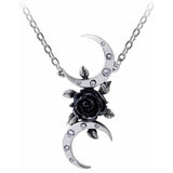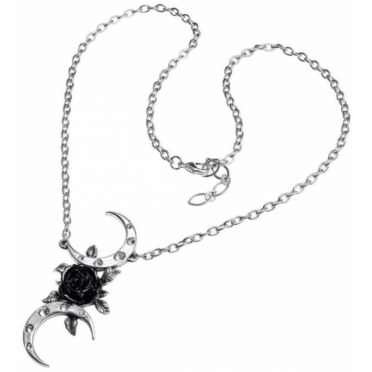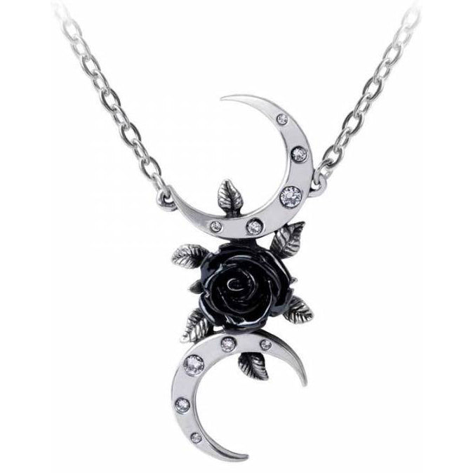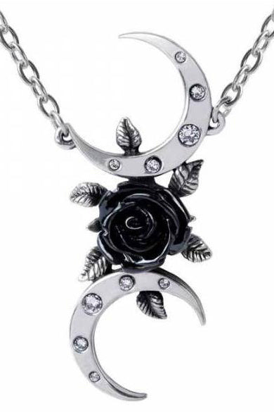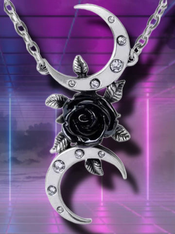 An alternative allegory for the Triple Moon Goddess, seen from a romantically oblique perspective, with a black rose 'moon' and tangental, crystal studded crescents to celebrate the mysticism of Wicca. Dazzle with this distinctive Alchemy design!