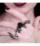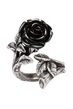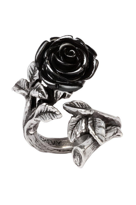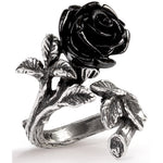 The Rose of black romance will entrap its heart's desire and seduce them. Be the envy of your friends with this beautifully dark ring. A polished pewter twine of wild roses wraps itself around your finger, featuring a statement acrylic black rose.