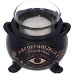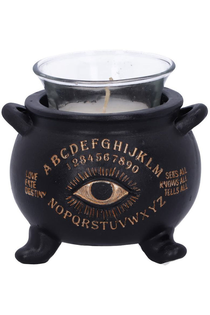 This small cauldron candle holder is any occult enthusiasts dream. Holding a small glass candle holder, this cauldron has a matte black finish and features a golden all-seeing eye at the centre. Emblazoned in Ouija Board lettering and numbers, the cauldron has the words 'Love, Fate, Destiny' and 'Sees all, Knows all, Tells all' flanking the Eye. Cast in the finest resin, this piece would make the perfect addition to any dark altar.