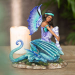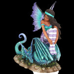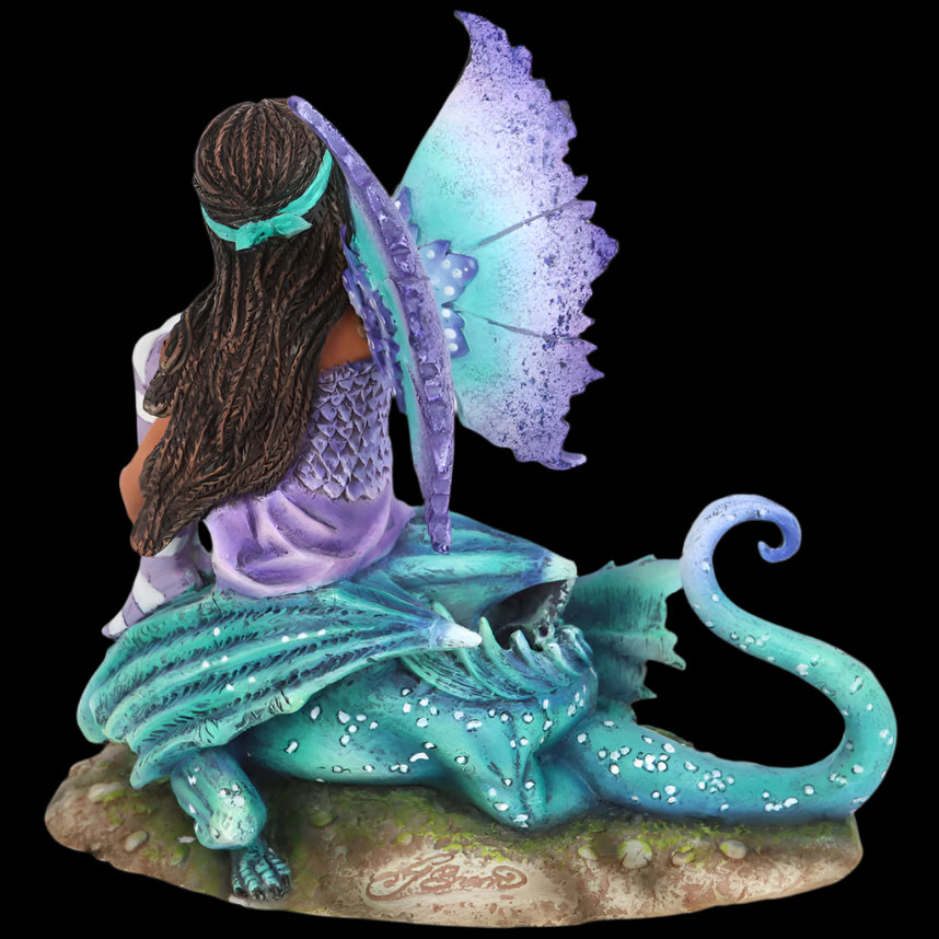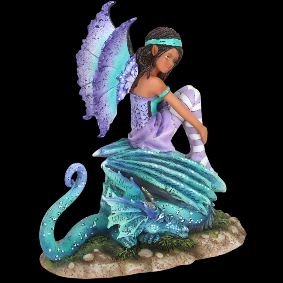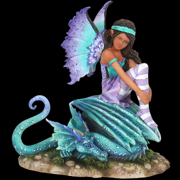This meticulously crafted figurine beautifully translates every magical detail of Amy Brown's original artwork. Featuring exquisite hand-painted accents in striking purple and teal hues, this graceful fairy is depicted in a moment of serene companionship, sitting elegantly atop her loyal dragon companion. It's a breathtaking blend of two beloved fantasy elements, creating a truly unique and harmonious display piece.