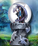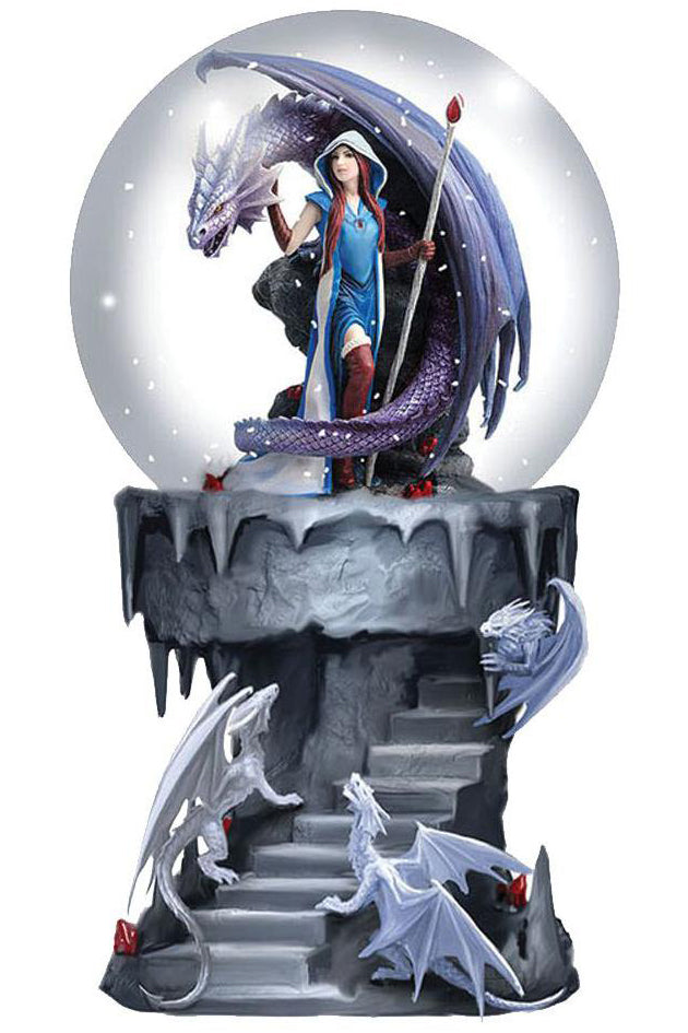 From the imagination of world renowned Gothic and Fantasy artist Anne Stokes, this Snowglobe is inspired by her Dragon Mage Artwork. On a rocky platform within the globe stands a red-haired mage, wearing a long, white flowing robe over her blue dress, brown gloves coming to her elbows. In her left hand she holds an arcane staff, a red egg-shaped jewel set in the end glowing with magical power. A violet-tinged Dragon curls around her, wings shielding her protectively, while she lifts her other hand to scratch under their chin. Around them, glowing red crystals emerge hesitantly from the rock. The stand beneath the globe acts as a stairway for several small dragon hatchlings to reach the platform above. Perfect for any mantelpiece or coffee table, this Snow Globe is the perfect gift for anyone who wants to shake a little magic into their life.