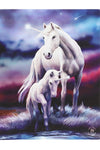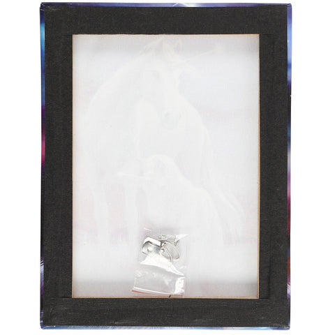 Renowned fantasy artist Anne Stokes captures the essence of eternal love in this stunning canvas plaque. Measuring 19cm wide and 25cm high, it depicts a majestic unicorn mare gazing lovingly at her foal under a breathtaking twilight sky. The intricate details of the scene, from the shimmering fur of the unicorns to the vibrant colors of the sky, create a sense of wonder and enduring connection.