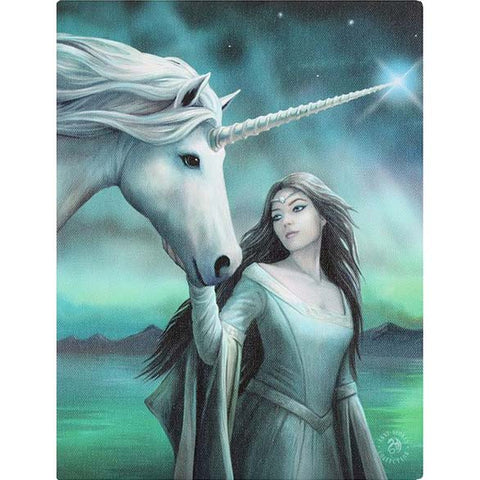 Anne Stokes's North Star artwork depicts a serene scene bathed in the ethereal glow of the aurora borealis. A young woman, clad in flowing white, rests peacefully beside a majestic unicorn. Their gazes are fixed on the North Star, a symbol of hope, direction, and unwavering connection. The intricate details of the woman's gown, the unicorn's horn, and the swirling lights of the aurora borealis are brought to life on high-quality canvas, creating a visually stunning and emotionally resonant piece.