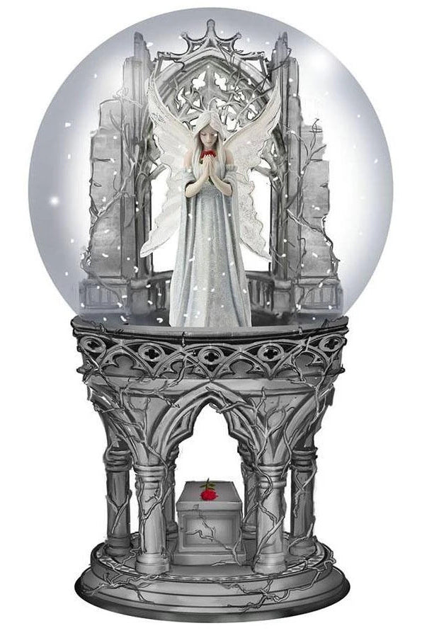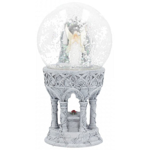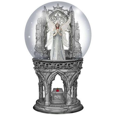 Coming from the twisted imagination of world-renowned Gothic and Fantasy artist Anne Stokes. Standing with head bowed, a white-haired Fairy wears a long white lace dress, white wings open behind her with the same pattern repeated on them. Head bowed and eyes closed, she holds a small bouquet of red roses to her face, lost in a reverie. After everything that has happened, after all that was said and done, all that is left is love. That’s all she has. Perfect for any mantelpiece or coffee table, this Snowglobe is the perfect gift for anyone who wants to see a little magic every time they shake it.