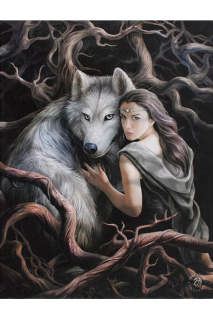Unveil a powerful bond between human and animal in this captivating canvas print featuring the renowned fantasy artist, Anne Stokes' "Soul Bond" artwork. This high-quality, full-color piece depicts a young woman nestled comfortably beside a majestic wolf, their connection radiating warmth and trust.