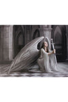 The picture features a breathtaking scene: a majestic angel, clothed in flowing white robes, knells amidst a serene cathedral. Anne Stokes' mastery of light and shadow creates an aura of serenity as the angel gazes upwards, bathed in a celestial glow. The angel's outstretched hand suggests a gentle blessing, inviting a sense of calm and hope into the viewer's heart.