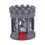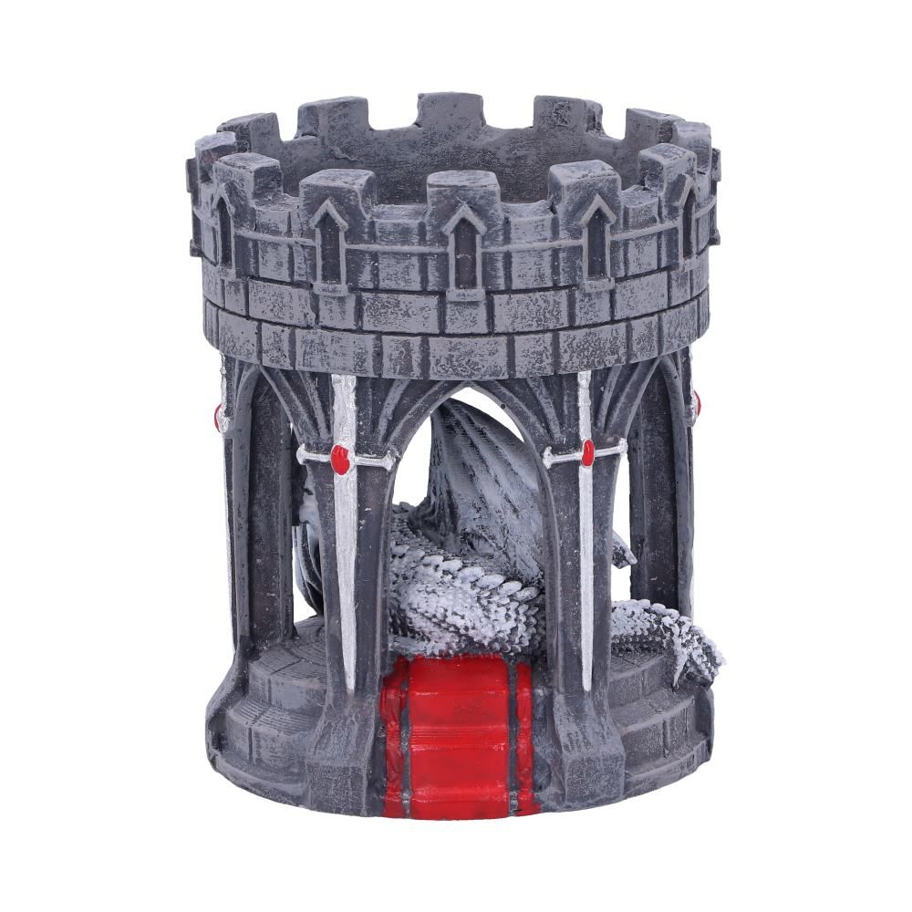 From the imagination of world renowned gothic and fantasy artist Anne Stokes, comes this Valour Tea Light Holder. A fierce white dragon lays peacefully, sleeping under the arches of the rock tower, not to be disturbed. Surrounding the the arches are shining silver swords with ruby red gemstones ready to use if an attack occurs. Cast in the finest resin before being hand-painted, this Valour Tea Light Holder will add a gothic glow to any space.