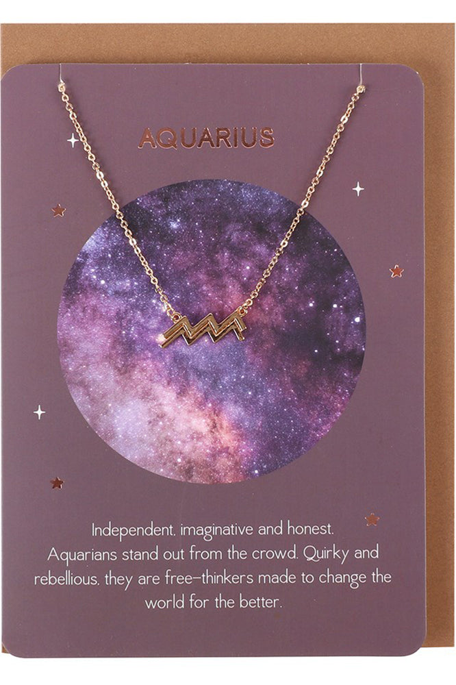 A gold-tone zodiac necklace beautifully presented on a matching greeting card that's perfect for every Aquarius. Part of the Written in the Stars range of celestial gifts and homeware. 22cm chain with lobster clasp closure. Nickel-free stainless steel. Includes envelope. Card left blank inside.