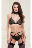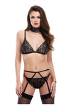 • Complete 4-Piece Set: The set includes a sheer bralette, a matching lace and strap g-string, a strappy garter belt, and a lace choker.