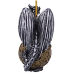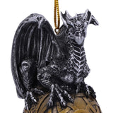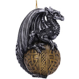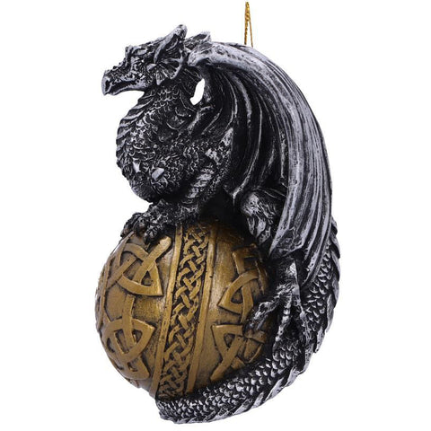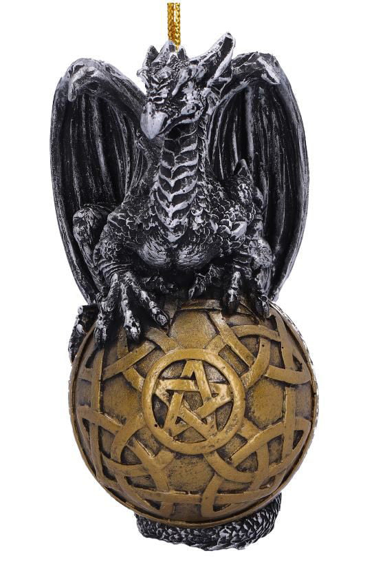 Suspended from a golden thread, this beautifully crafted Dragon perches on top of his treasured metallic golden sphere. Decorated with intricate patterns and centred by a pentagram, this piece would make a quirky festive accompaniment or would be perfect as a year-round piece of fantasy decor. Cast in the finest resin before being lovingly hand-painted this piece is perfect for those who have an affinity for mythical beasts.