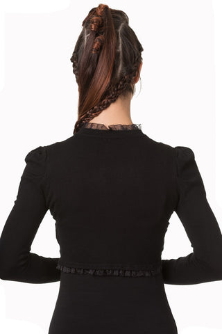 Black Knit Long Sleeve Bolero Shrug Style Cropped Cardigan with Black lace front panels and organza style ruffle trim. This gothic bolero fastens at the neck with a black ribbon tie.