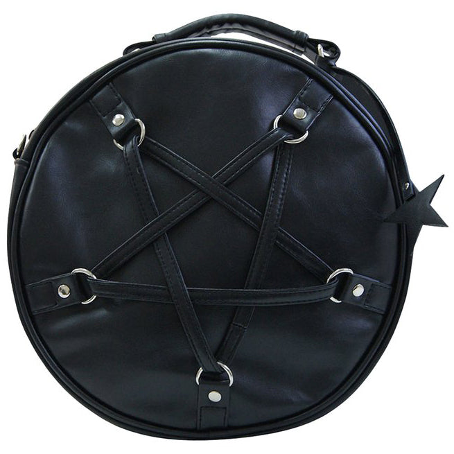 Banned Trime Travel Hand Bag, Circular Handbag with faux leather pentagram strap detail and Adjustable Shoulder Strap.