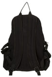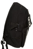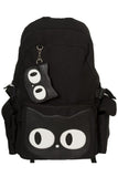 From Banned Alternative Wear, this awesome black canvas large backpack style bag has padded shoulder straps, a main zipped compartment and on the front a smaller zipped pocket with a big faux leather kitty face with large white eyes on the front. There is a matching cat head mini coin purse attached to the bag with a small ball chain. The bag also has a magnetic press stud flap closing pocket on each side for carrying small items etc. The main compartment has a small zipped purse pocket and small slip pockets for mobile phone etc inside. A great sized bag for school, college or university!