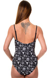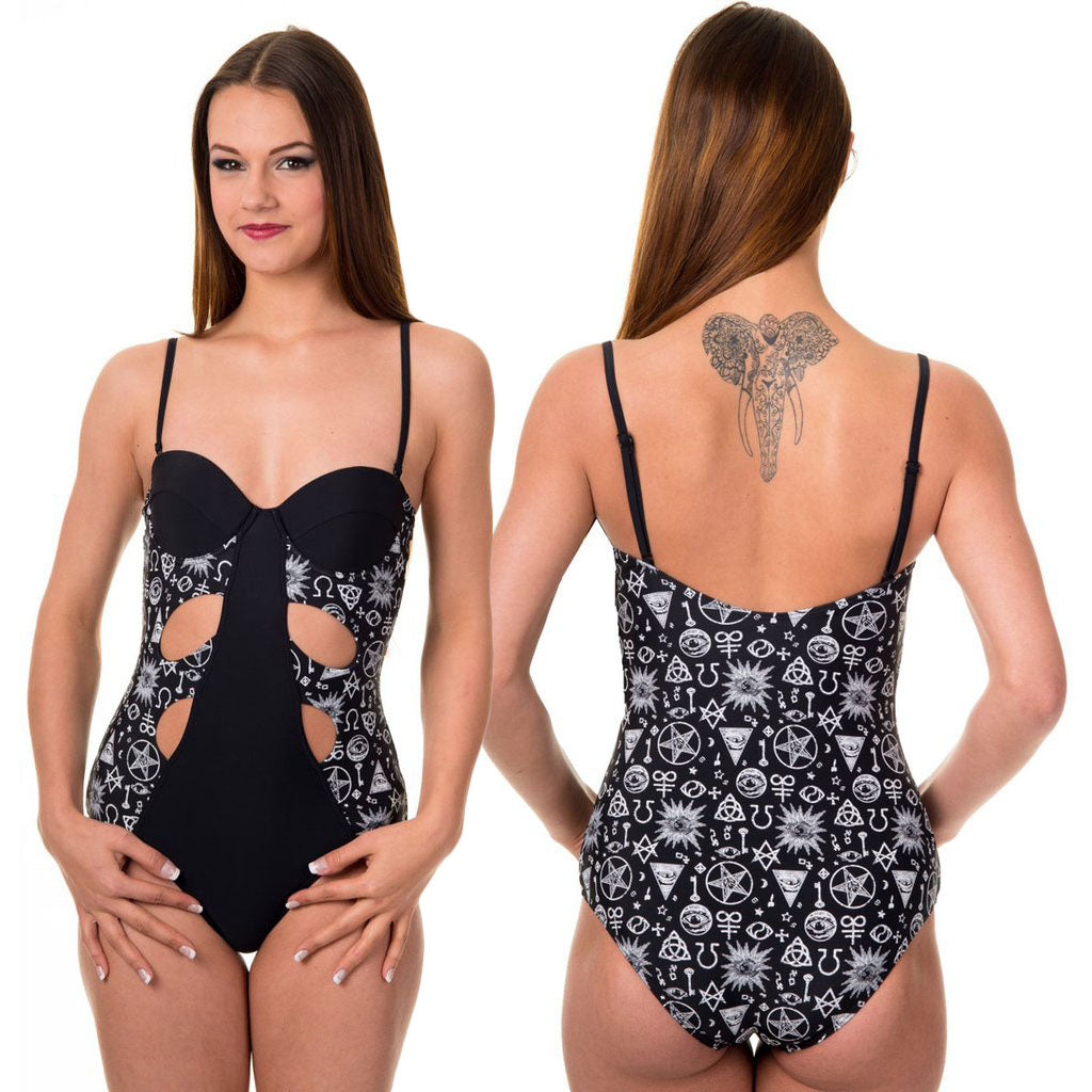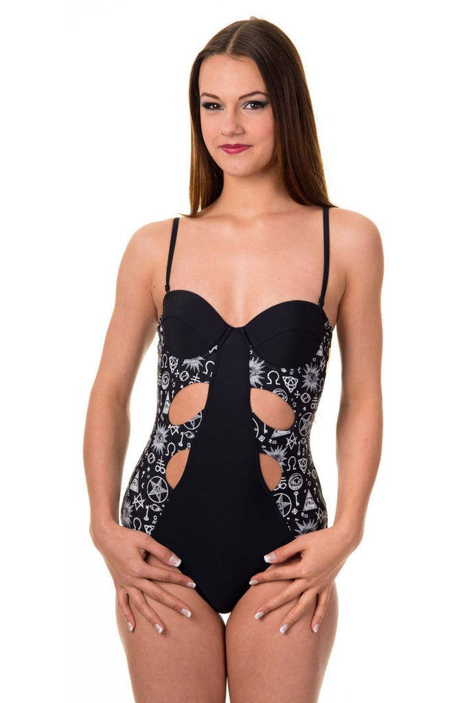 This eyecatching black one piece gothic swimsuit with a cut out down each side at the front has formed cups with grip gel to keep it up when worn without the detachable shoulder straps! The main body of the swimsuit features a black magic symbol design in white on the front and back, with a central black panel down the front and black cups.