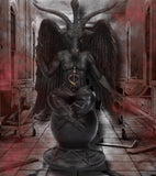 This mystical figurine is cast in the highest quality resin before being carefully hand-painted. Resting in the centre of a pentagram, the globe of the earth acts as Baphomet’s seat. Sitting cross-legged on top of the world, Baphomet sits, symbolizing the sum total of the universe. Legs ending in cloven hooves, the staff of Asclepius rises from their crotch. Their right arm is raised in a magical blessing with the word SOLVE written on their forearm, while their left arm is stretched downwards and outwards invitingly, forearm bearing the word COACULA. Their triple-horned goat’s head stares directly forwards as their wings stretch out behind them. Worshipped by occultists from Jacques de Molay’s Templars to Alistair Crowley, Baphomet has long been a symbol of free-thinking heresy and forbidden knowledge.